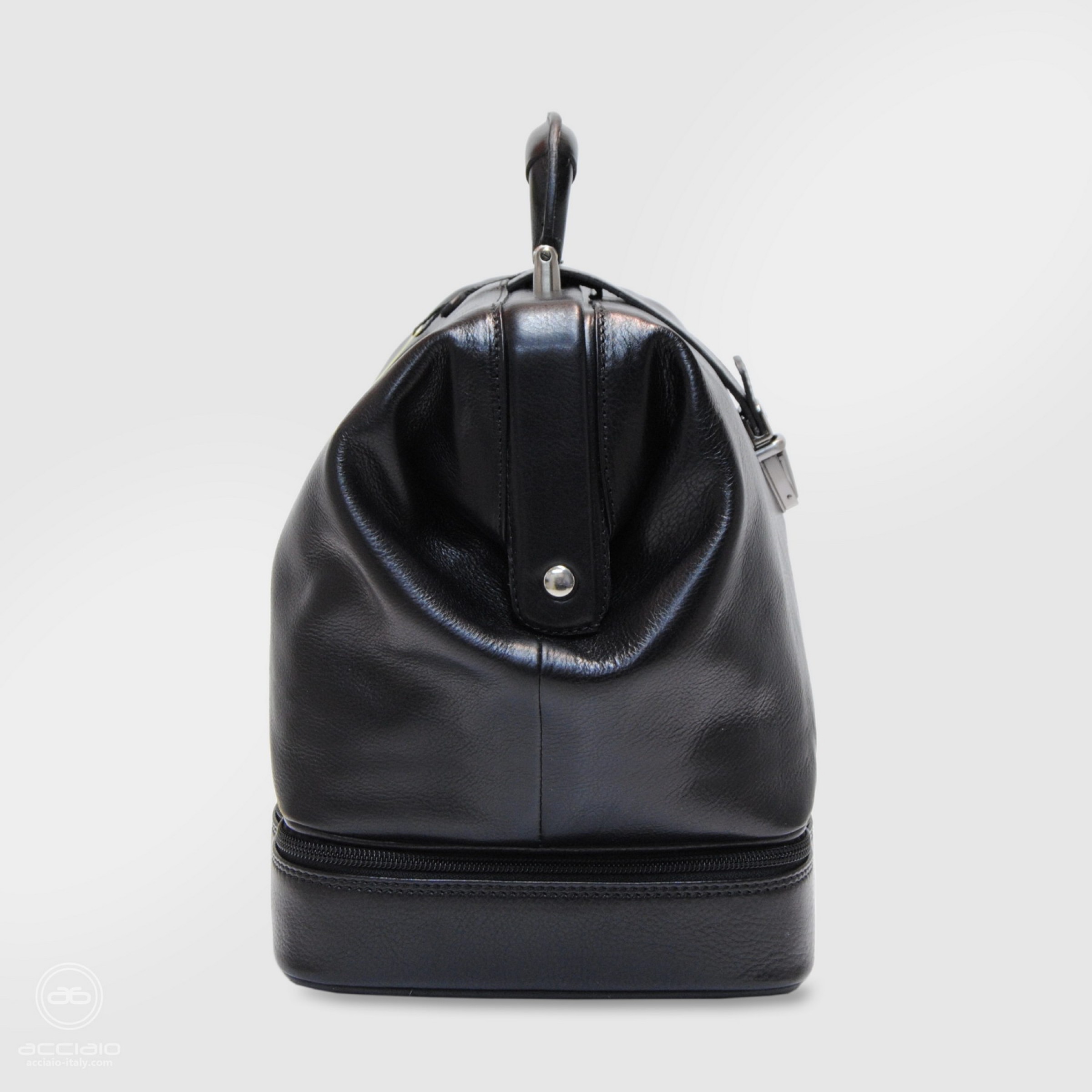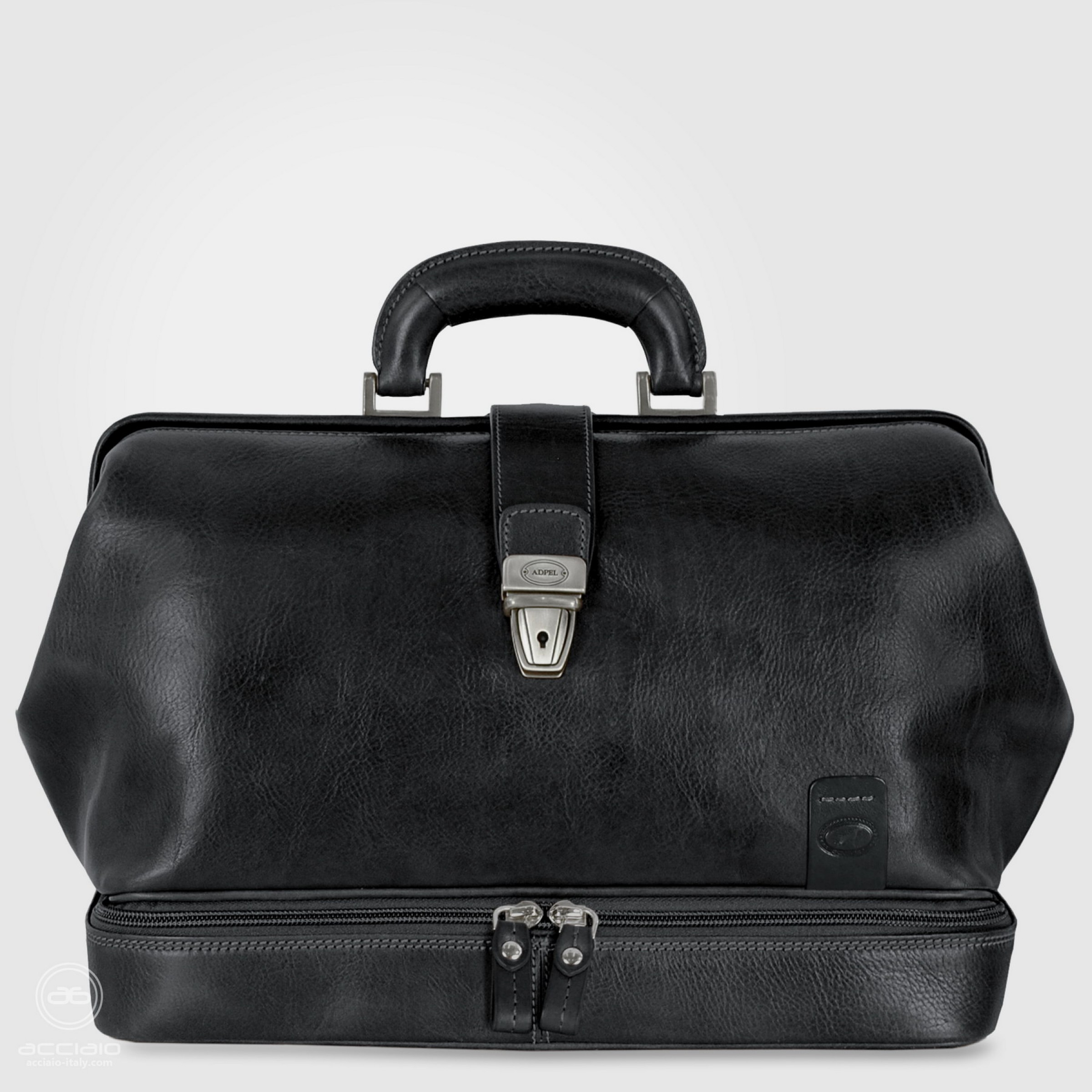 Borsa da medico in pelle " per eccellenza " in colore Nero. E' ormai un'icona che identifica il medico professionista e ne qualifica il prestigio. La borsa ha un grande impatto estetico ottenuto grazie al mix tra le forme classiche arrotondate, la qualità degli accessori e la bellezza unica della pregiatissima pelle vegetale.