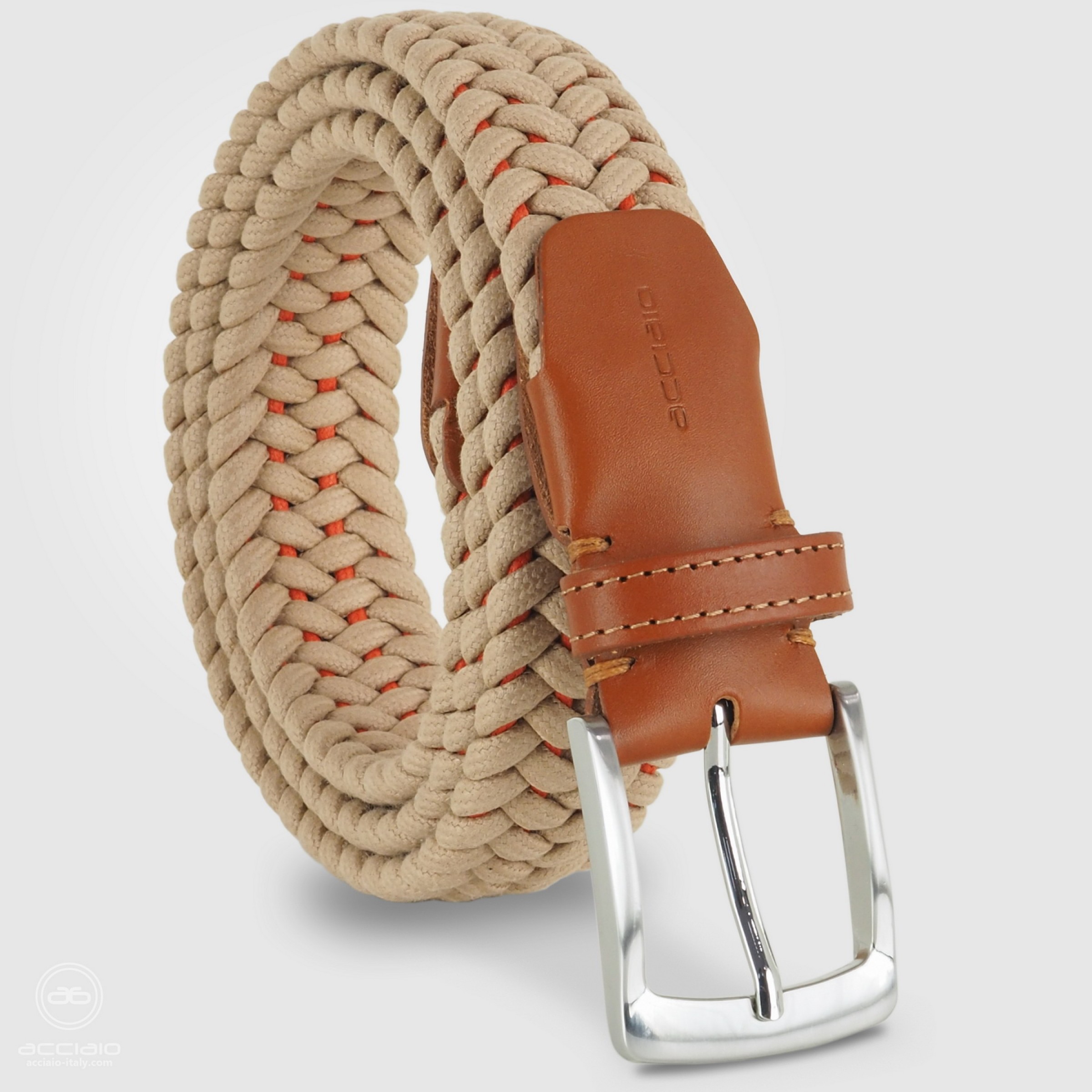 Braided Stretch belt made by Elastic multicolor Orange Red Khaki with leather appliques in fashion c..