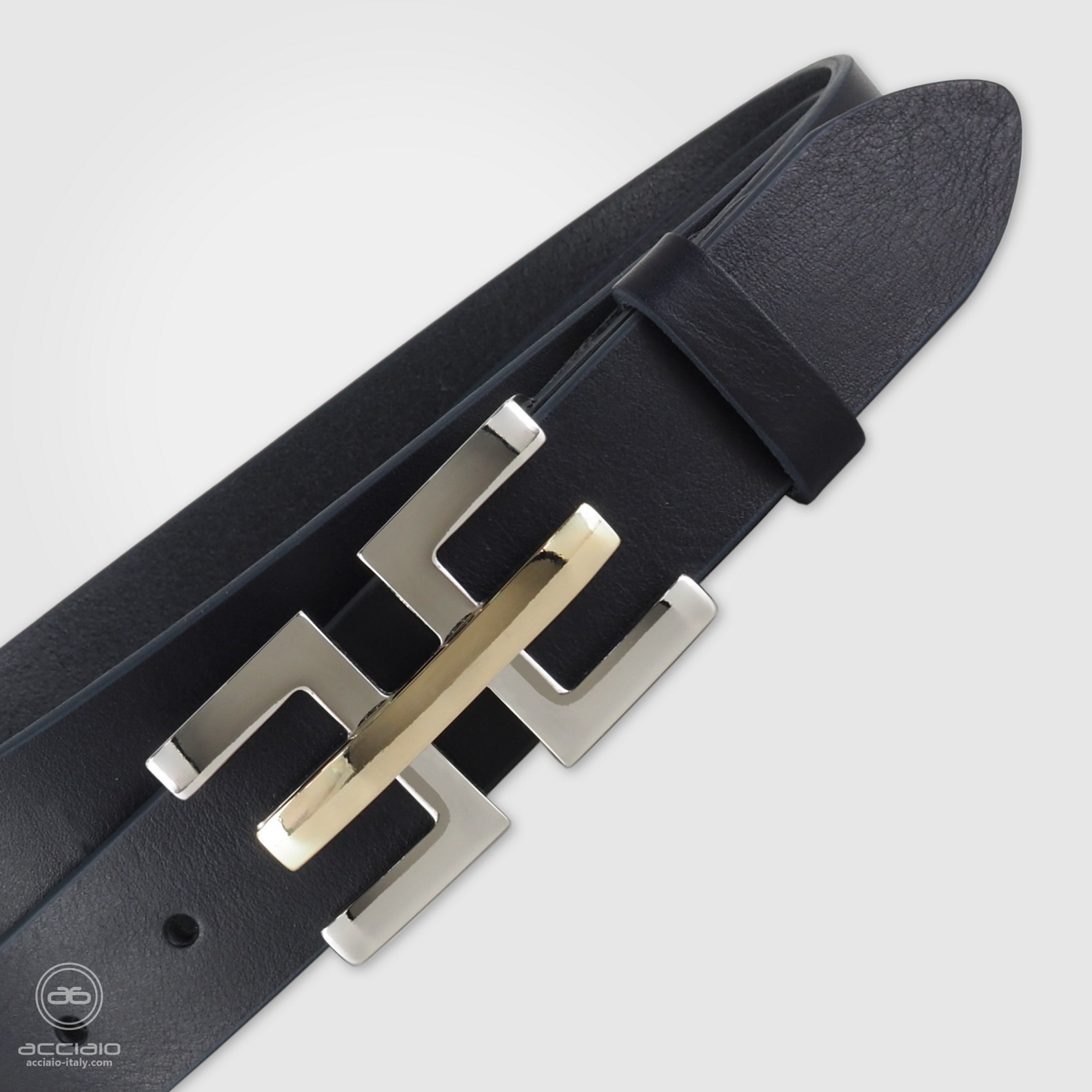 Cintura moda da donna in pelle cuoio Blu con fibbia Echo nickel-free. Questa cintura donna si adatta ad ogni abbigliamento femminile fashion ed elegante. Con il suo design pulito darà un tocco di classe al vostro outfit.