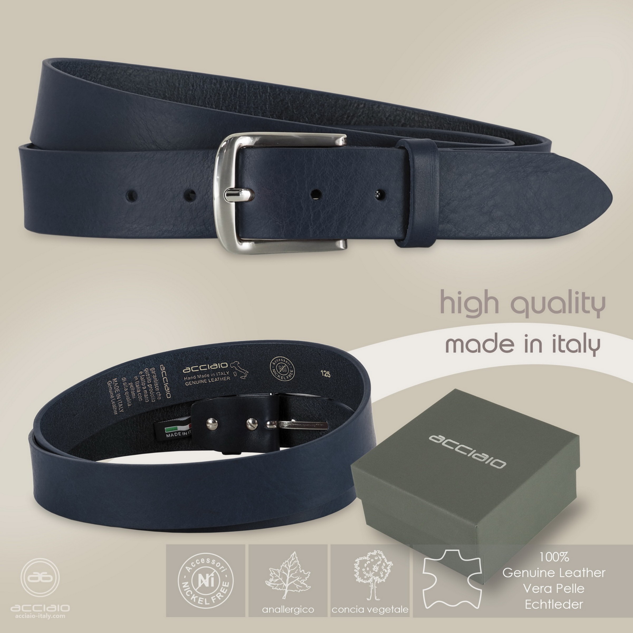 La cintura è realizzata in cuoio italiano ad alto spessore conciato al vegetale. Alta qualità artigianale italiana firmata Acciaio.