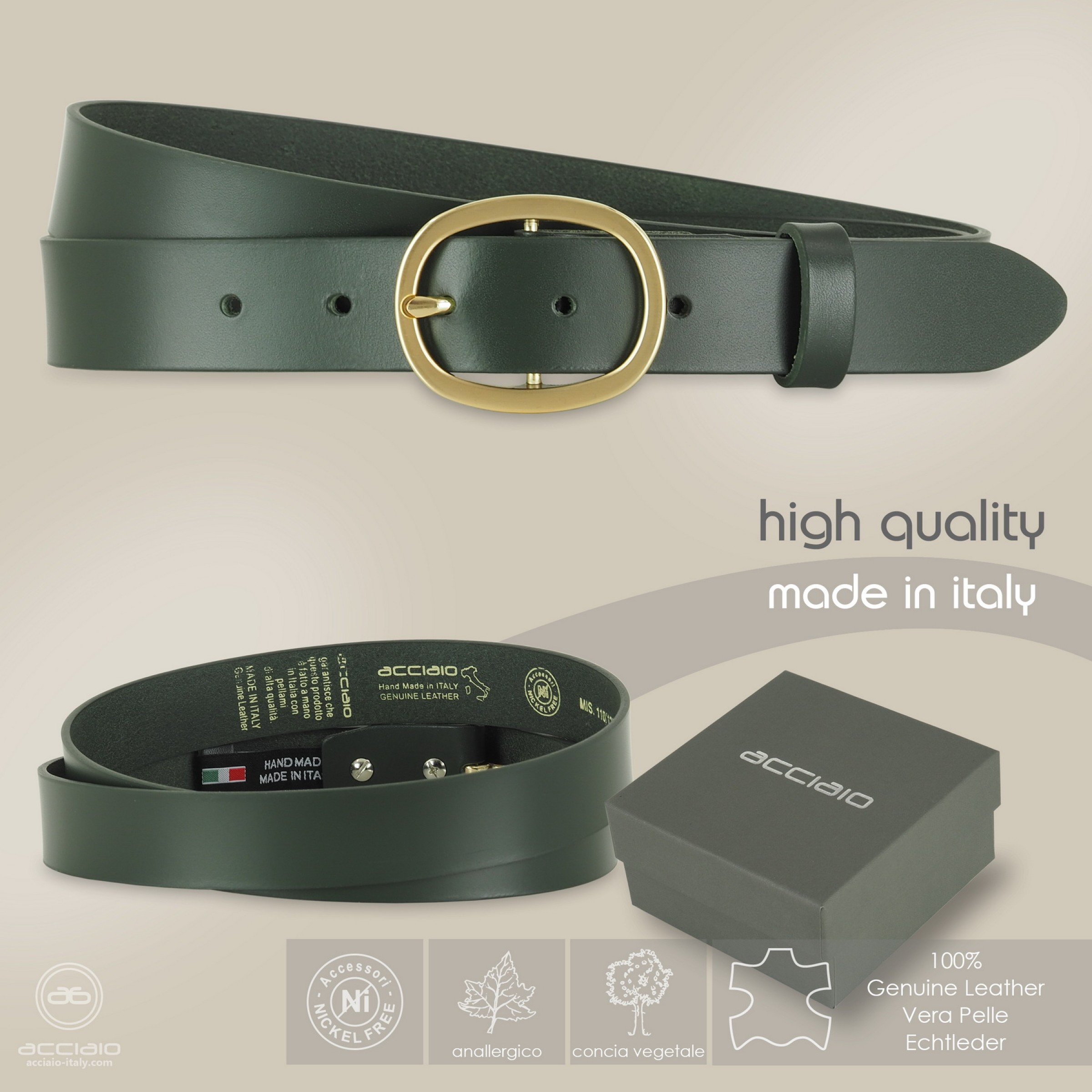 La cintura è realizzata in pregiato cuoio Toscano conciato al vegetale. Alta qualità artigianale italiana firmata Acciaio.