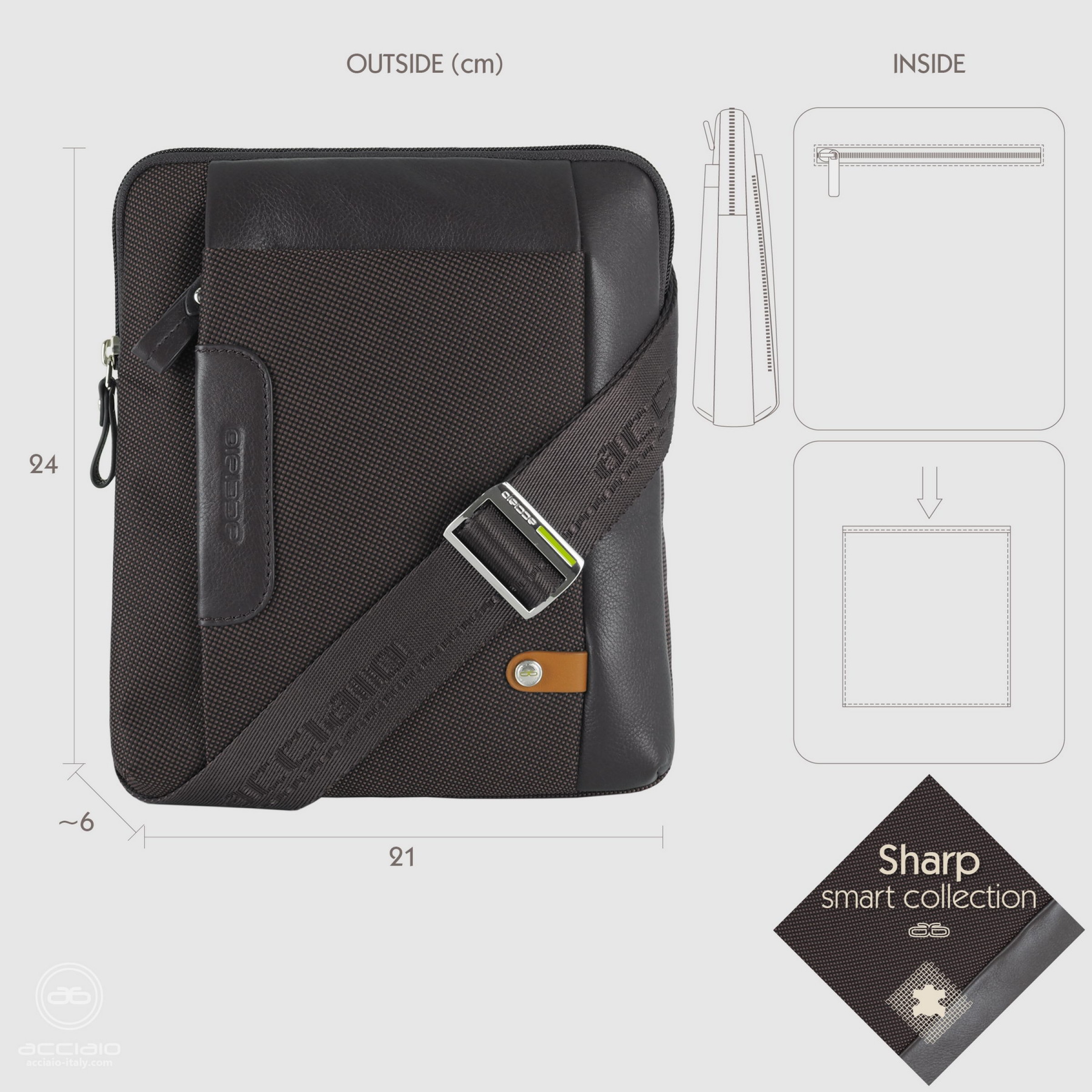 Men's shoulder bag in fabric and leather Brown/Moka color, Sharp style. The trapezoidal design with a soft structure allows for ample storage space at the bottom, without sacrificing the typical practicality of slim-sided bags. You won't be able to do without it! The front pocket is very practical for frequently used items like your smartphone.