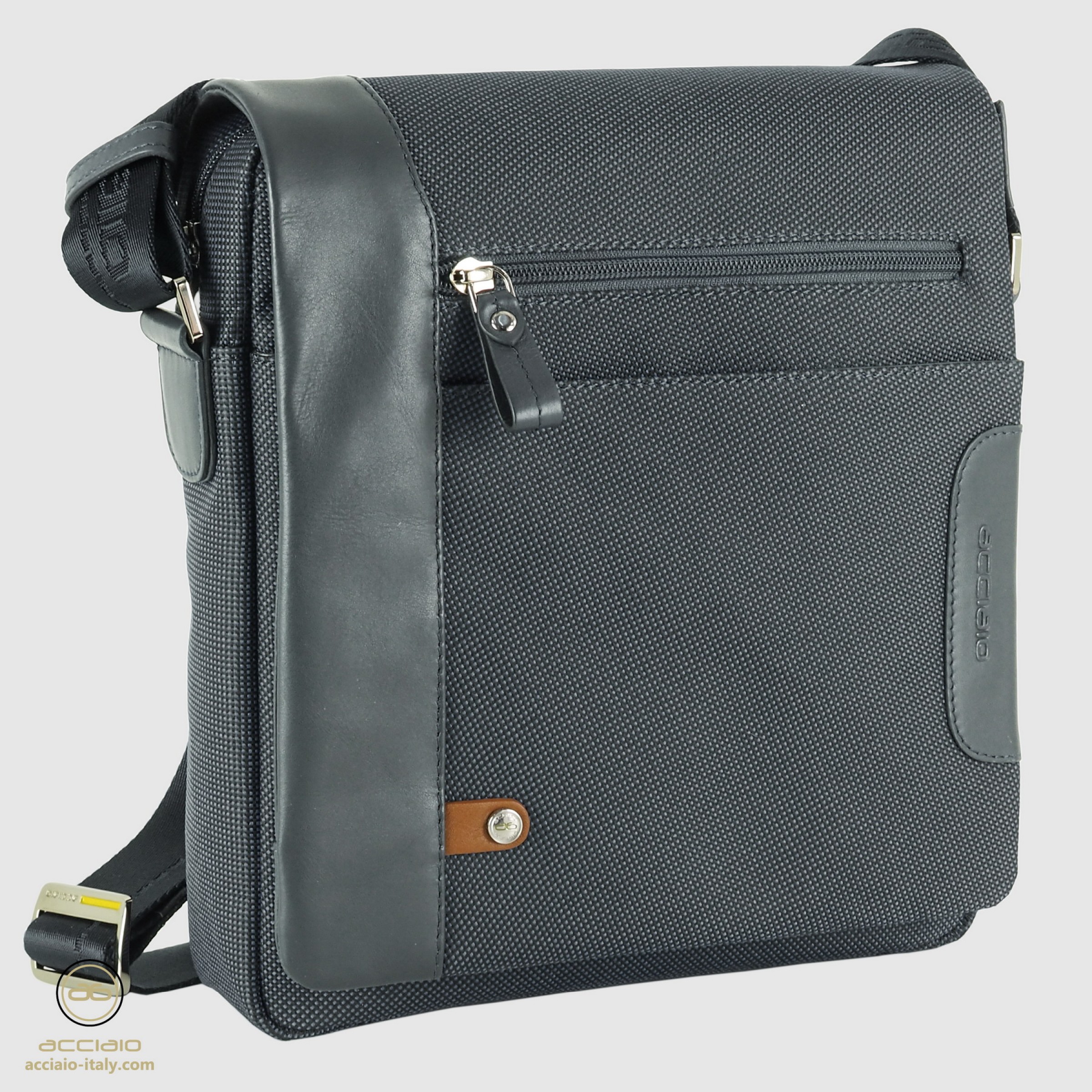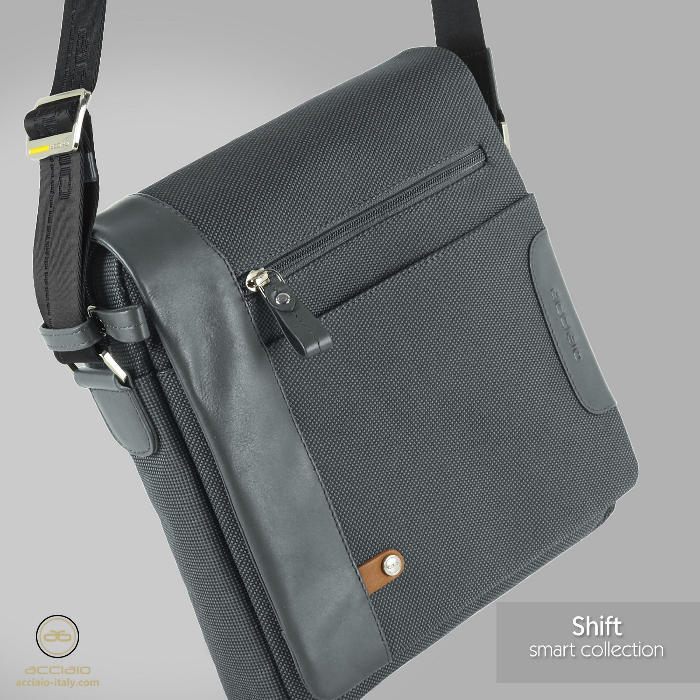 Men's shoulder bag with flap and wide gusset, Shift model, in fabric and leather Grey. This men's bag, in addition to having an original and exclusive design, is very popular for its capacity despite its small size. The main compartment is closed with a zip to prevent objects from falling out even when riding a motorbike. When the bag is closed there is a zip pocket at hand (generally used for documents), a pocket on the flap (to temporarily store small objects or even a phone) and a large back pocket on the back. Under the flap there is a large pocket and a zip pocket on the front side. Inside the bag there is a zip and two multifunctional pockets, for phone and wallet.