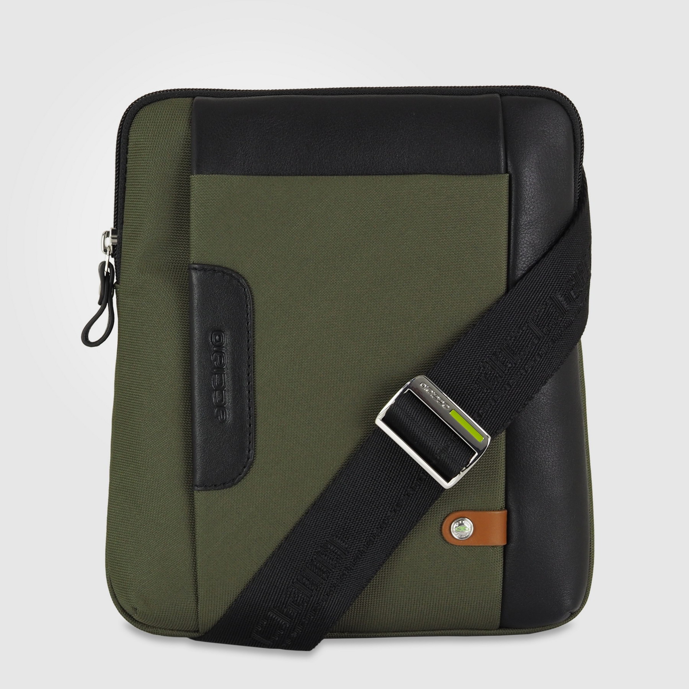 Men's shoulder bag in fabric and leather Green color, Sharp style. The trapezoidal design with a soft structure allows for ample storage space at the bottom, without sacrificing the typical practicality of slim-sided bags. You won't be able to do without it! The front pocket is very practical for frequently used items like your smartphone.