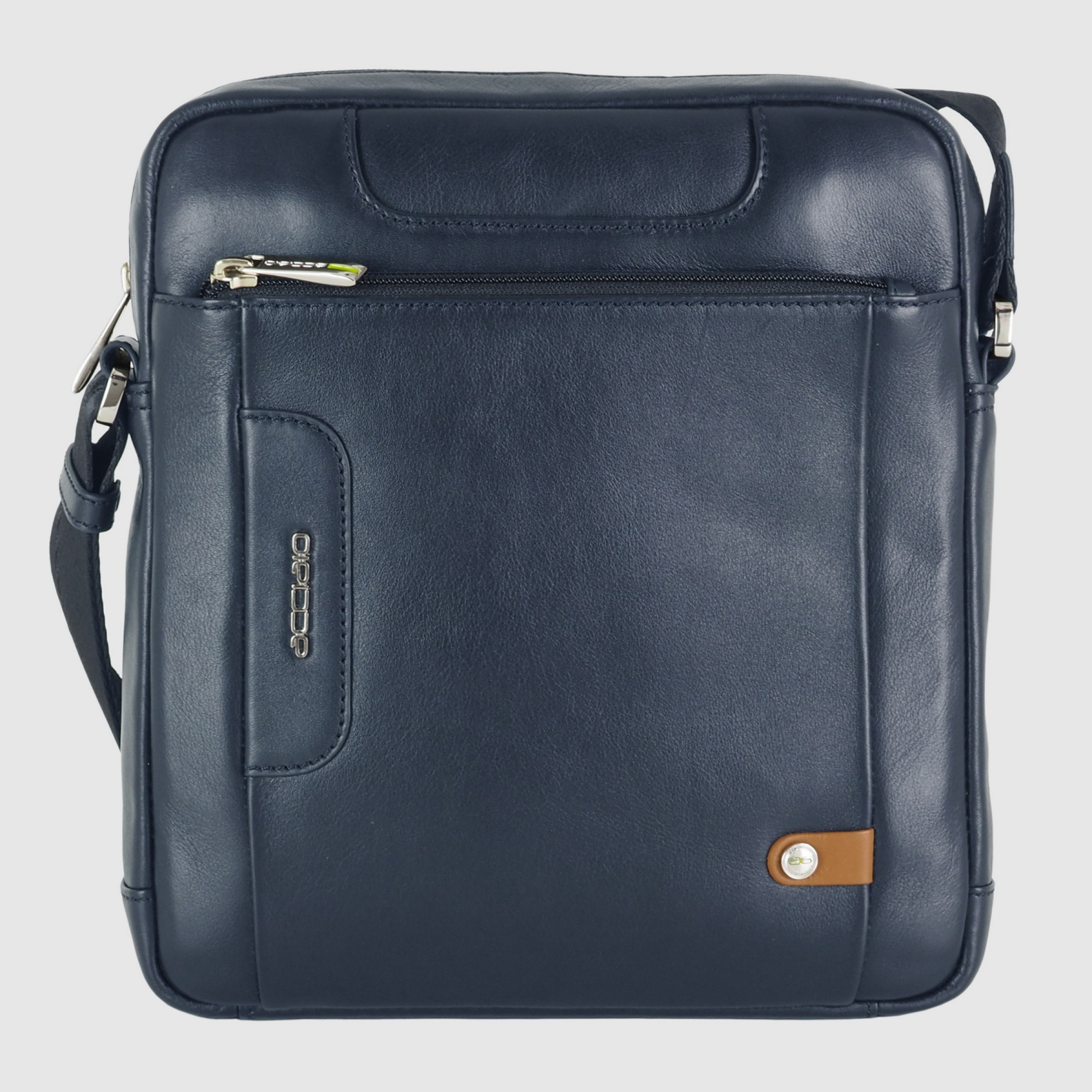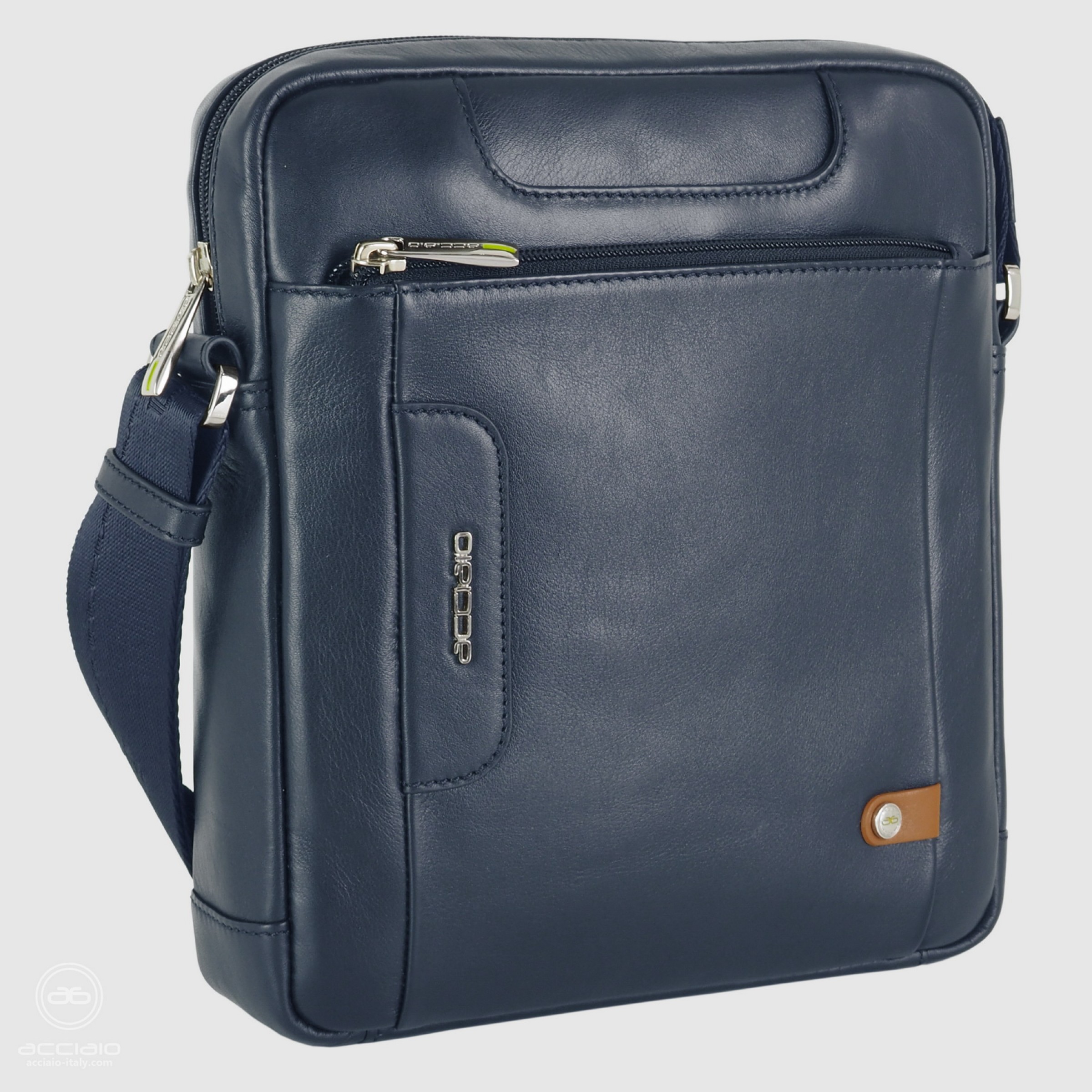 Large men's shoulder bag, Frame style, in leather Navy Blue. Practical and functional, this men's bag is highly appreciated for its original design and capacity despite its small size. The convenient front pocket allows you to always have your smartphone immediately available. There are zips both on the front and on the back. The wide side allows you to store many objects and the dimensions are adequate to contain tablets up to 11". The structure is reinforced on the bottom to make the bag more resistant during the time.