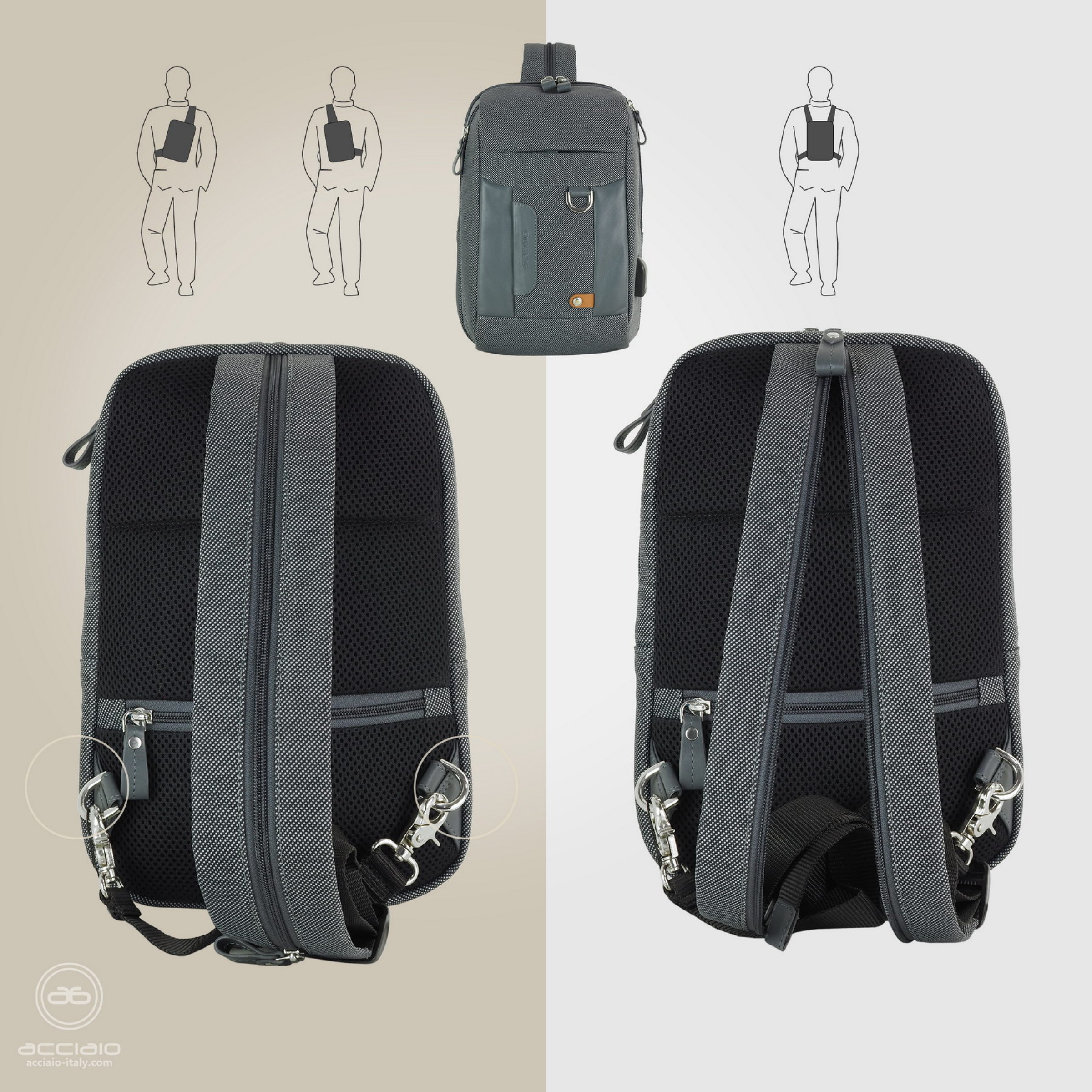 Monospalla uomo zaino piccolo multiuso "Jet" in tessuto e pelle Grigio. Un bellissimo monospalla che si trasforma in un comodo zaino piccolo ma ben organizzato. All'interno ci sono tasche e scomparti per ogni esigenza: tasca termica per mini bottiglia, tasca tablet, cavo per powerbank e naturalmente tasche per telefono, portafogli e occhiali. Questo piccolo zaino monospalla è ideale per una passeggiata nel tempo libero, per andare in moto o in bici. Se sei un foto amatore questo è uno zaino da fotografia ideale per contenere fotocamera ed ottica. Le dimensioni sono adatte sia ad adulti che a ragazzi. Il design unisex è adatto sia all'uomo che alla donna. Uno zaino che vi accompagnerà tutti i giorni con la sua praticità ed il suo stile originale.