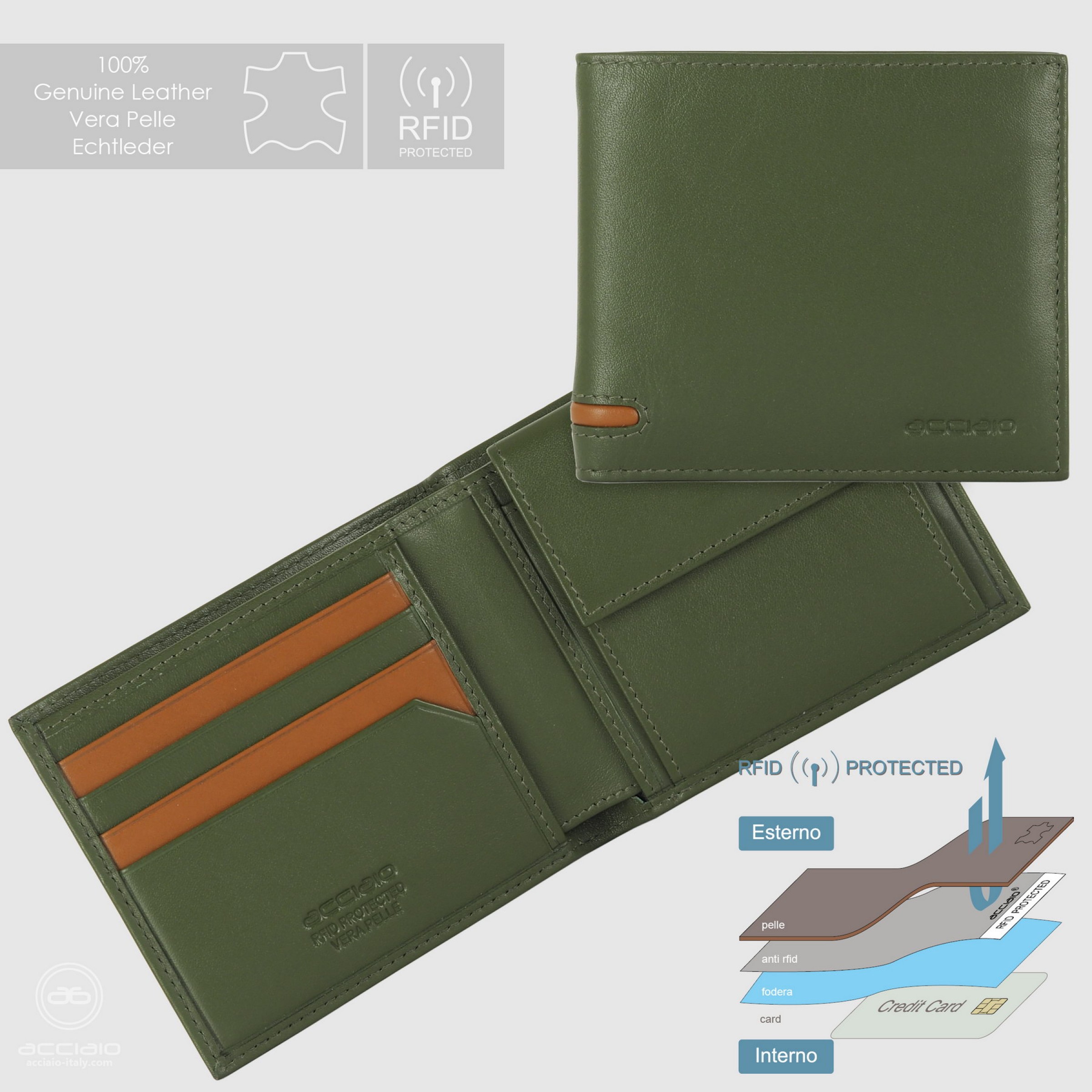 Portafoglio piccolo da uomo in pelle morbida colore Verde con portamonete e 7 tasche per carte di credito con protezione anti rfid. Questo modello è ideale per chi ama il portafoglio classico ma di dimensioni ridotte, preferendo dunque un portafoglio tascabile e compatto. C'è tutto il necessario ma in dimensioni più contenute. Nonostante le dimensioni contenute, questo portafoglio può contenere tutti i tipi di banconote. Le tasche per le credit card sono 7 in totale: 4 sono a vista e 3 sono nascoste all'interno del vano principale.