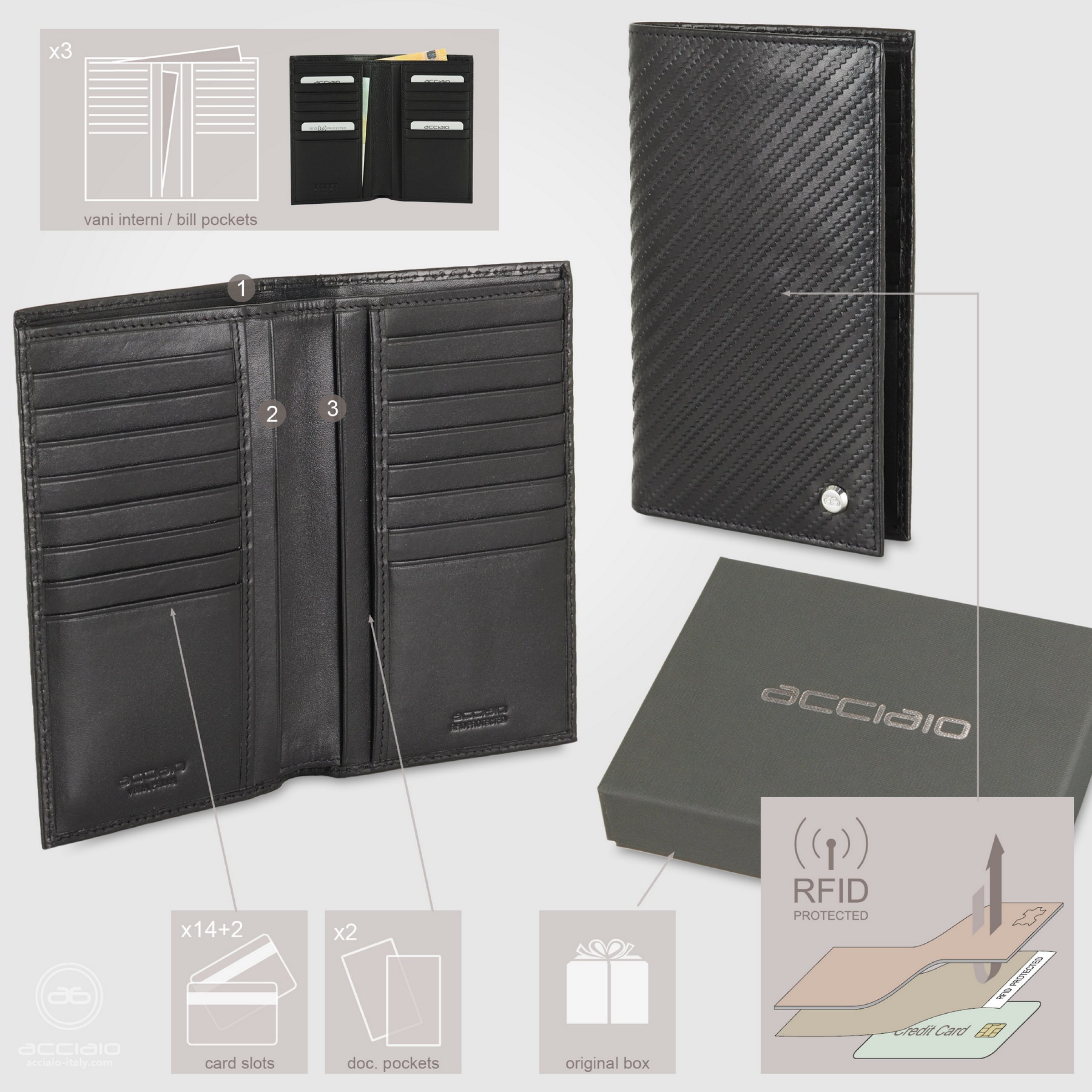 - Tasche carte di credito: 16 ( il primi due taschini sono più bassi, dedicati alle visit card )