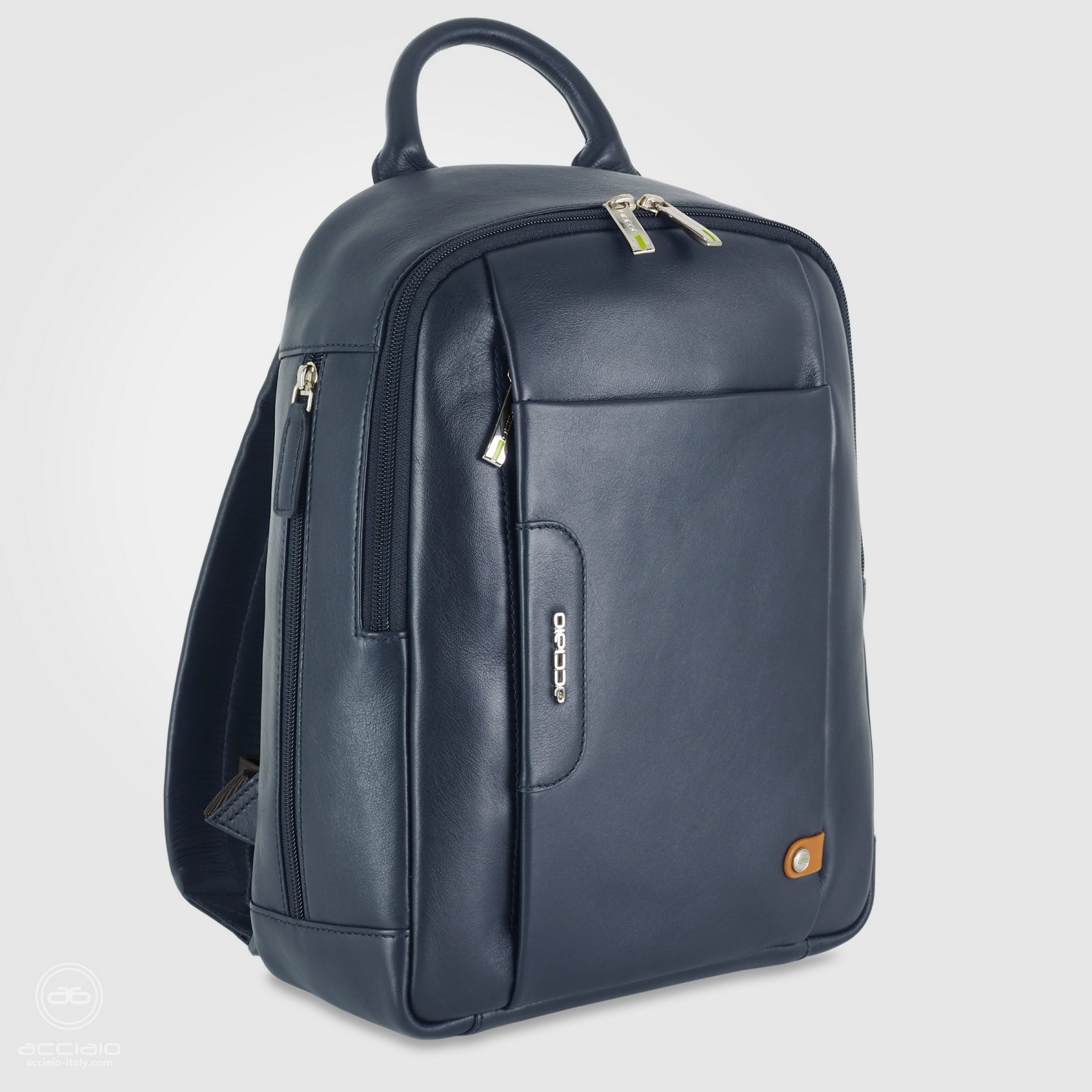Small backpack "Speed" in Blue leather. A small backpack with many pockets suitable for frequent use, perfect for leisure time. On the outside, there is a deep open pocket on the front for quick storage, a long zip pocket, a thermal pocket for a mini-bottle and on the back a zip pocket for storing a smartphone or wallet. Inside, there is a dedicated tablet pocket (max 11"), a zip and a multipurpose pocket for personal accessories. Thanks to the soft shoulder straps and padded/breathable back, this backpack is very comfortable, suitable for frequent use, for work and travel, for traveling by motorbike or subway. The unisex design is suitable for both men and women. A backpack that will accompany you every day with its practicality and original style.