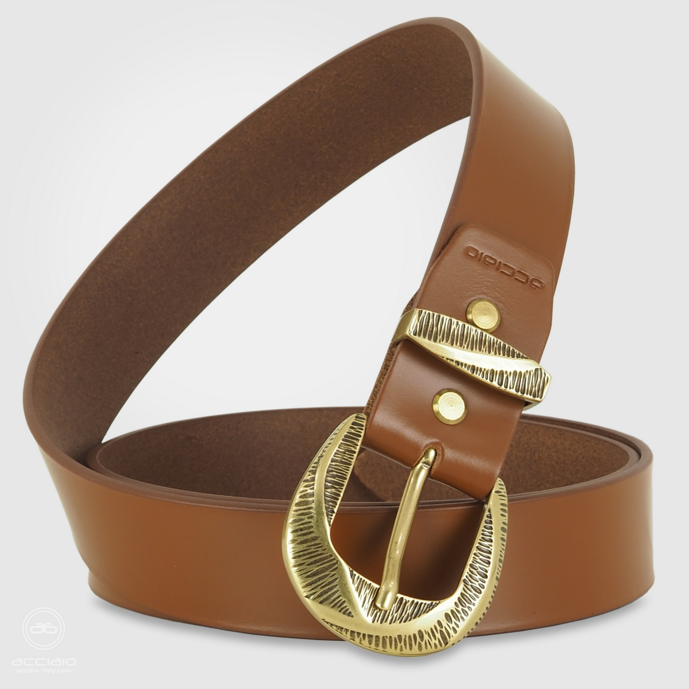 Woman's belt in smooth Leather Cognac with antique brass buckle Leaf